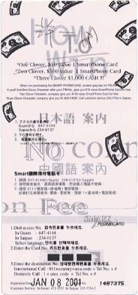 テレホンカードには期限があるから滞在中に使い切ったほうが良いですね、また、このカードを使っても島内電話の料金は別途掛ます。ホテルにもよりますが、0から0.8ドル/回です(1回の通話料金は通話時間とは関係ありません、ホテルで設定している基本料金だけです) このカードを使い(日本に1回の通話で)10〜30分位掛けたとして、料金は・・・島内通話1回分だけです (もちろん、テレホンカードの通話できる時間はその分だけ減りますが、終わりになるまで使えます) 日本への掛け方(03-5432-0001へ電話する場合) @外線への発信番号を押す A発信音を確認し 234-0137 をダイヤルする Bアナウンスが出るので指示に従って 2 (日本語を選択)を押す C(番号を隠してある銀色の部分をあらかじめ削って数字を出しておき) その数字を順にダイヤルをし # を押す D次にアナウンスが聞こえ“あなたの電話番号をダイヤルしてください”と言ったら 011-81-3-5432-0001 とダイヤルをし#を押す Eアナウンスで通話度数の連絡の後、コール音が聞こえ(03-5432-0001)に繋がります よくわからない場合は、レストランで聞いてください。 | |